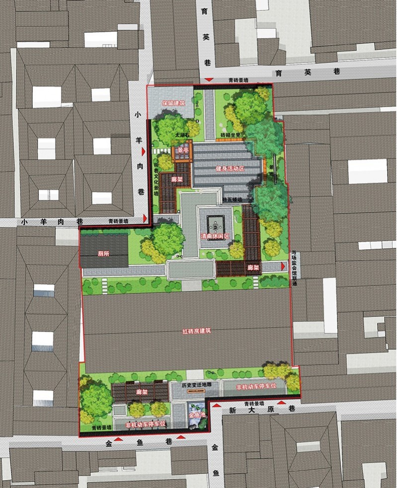 項目位于老城區南河下歷史文化街區板塊內,蘇唱街南側育英巷盡頭,西側隔羊肉巷為王氏民居,東側緊靠場鹽會館,南側隔金魚巷為陀林。設計范國南北長約60米,東西寬約35米,規劃總面積為1372平方米。